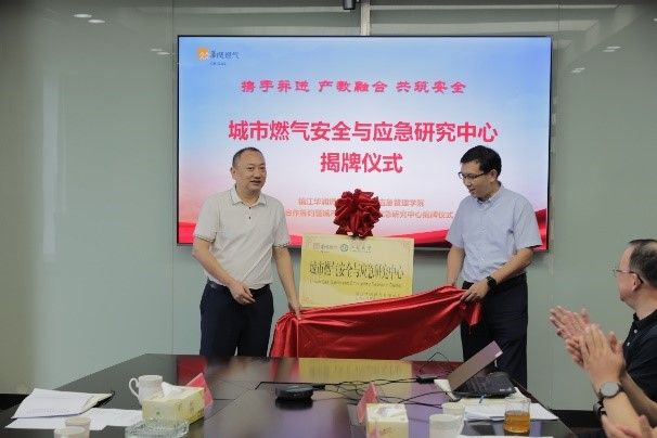 On September 19, 2025, in order to deepen the collaborative innovation of industry, academia, research, and application, and to assist in the improvement of urban gas safety governance capabilities, the unveiling ceremony of the "Urban Gas Safety and Emergency Research Center" jointly established by Zhenjiang Huarun Gas Co., Ltd. and the School of Emergency Management of Jiangsu University was held at Zhenjiang Huarun Gas Co., Ltd. Leaders from the headquarters of China Resources Gas, leaders from Zhenjiang China Resources Gas Company, leaders and professors from the School of Emergency Management at Jiangsu University, relevant department heads and key teacher representatives, as well as leaders and expert representatives from the Municipal Emergency Management Bureau and the Municipal Housing and Urban Rural Development Bureau attended the event together.