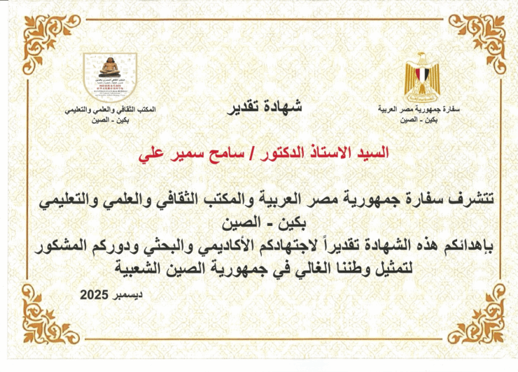 Certificate of Appreciation: In December 2025, the Embassy of the Arab Republic of Egypt in Beijing awarded Dr. Sameh Samir Ali Atwa in recognition of his outstanding achievements in academic research and his exceptional contributions to representing Egypt in China and advancing scientific and cultural exchanges.