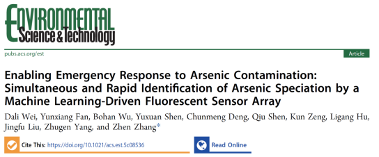 近日,我院张祯教授团队在砷形态快速识别与预测方面取得新进展。该研究聚焦砷污染的应急响应监测这一研究背景,开发了一种基于机器学习算法的新型荧光传感器阵列,用于快速识别与预测多种砷形态(AsIII、AsV、MMAV和DMAV)。该研究提供了一个可靠、快速且智能的砷形态分析平台,为水质评估和应急响应提供了有力的工具。相关成果以“Enabling Emergency Response to Arsenic Contamination: Simultaneous and Rapid Identification of Arsenic Speciation by Machine Learning-Driven Fluorescent Sensor Array”为题发表于Environmental Science & Technology。江苏大学为第一完成单位,我院青年教师韦达理为第一作者,张祯教授为通讯作者。