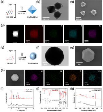 图 1. NH2-MIL-88 (Fe)和 OH-MIL-88 (Fe) 的合成与表征