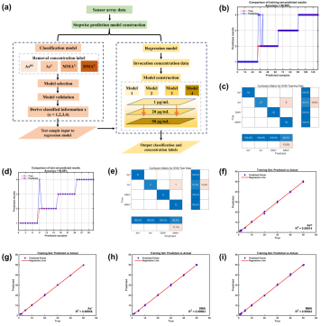 利用支持向量机器学习算法建立了一个用于砷形态定性和定量分析的逐步预测模型。集成机器学习算法的传感器阵列可以实现不同浓度下四种砷形态的准确预测与分类,且具备良好的准确率。基于所建立的回归预测模型,也实现了砷形态的准确定量分析。