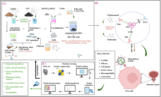 本研究提出一种人工智能(AI)引导的多刺激响应纳米药物递送新策略。以天然可再生木质素为核心,构建 Lignin@GO@ZIF-8 复合纳米载体,实现pH/氧化还原双响应释药机制。该体系可在肿瘤特有的弱酸性与高谷胱甘肽(GSH)环境中快速释放药物,而在正常生理条件下保持稳定。同时,实现5-FU与二甲双胍(Metformin)的协同共递送,在肿瘤细胞内发挥多通路抗癌作用。研究结果表明,在肿瘤模拟环境中药物释放显著增强;在前列腺癌 LNCaP 细胞中,72 h 细胞活性最低降至18%,同时对正常细胞保持良好生物相容性。该研究展示了“AI + 天然生物质材料”在智能纳米医学中的应用潜力,为可预测、低成本的精准药物递送体系提供了技术支撑。