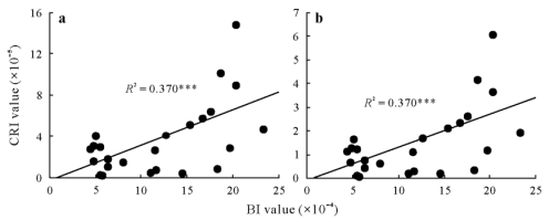 图2. 设施土壤Cr生物可利用性指数值与蔬菜Cr致癌指数值(a.成年人;b.儿童)的相关性